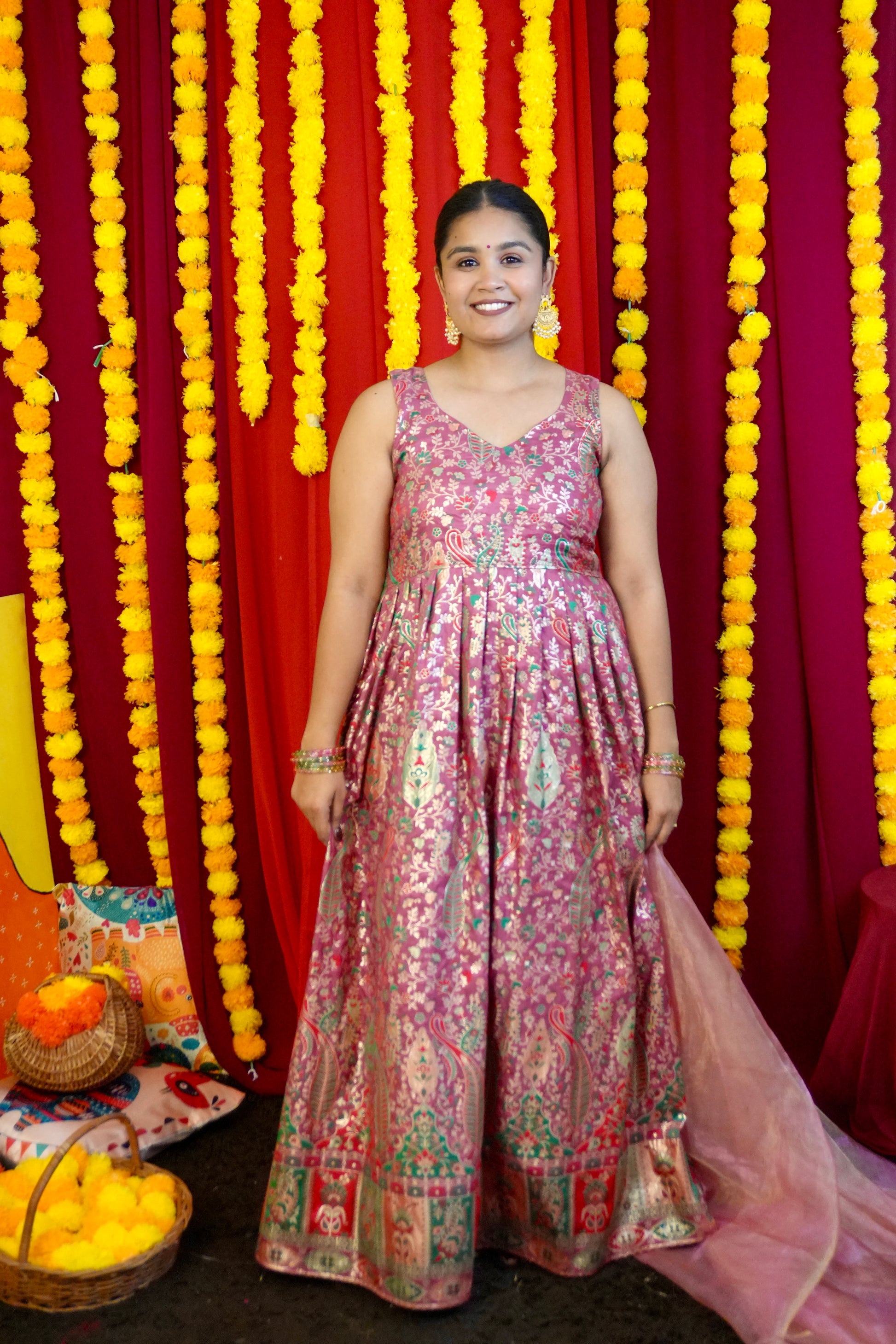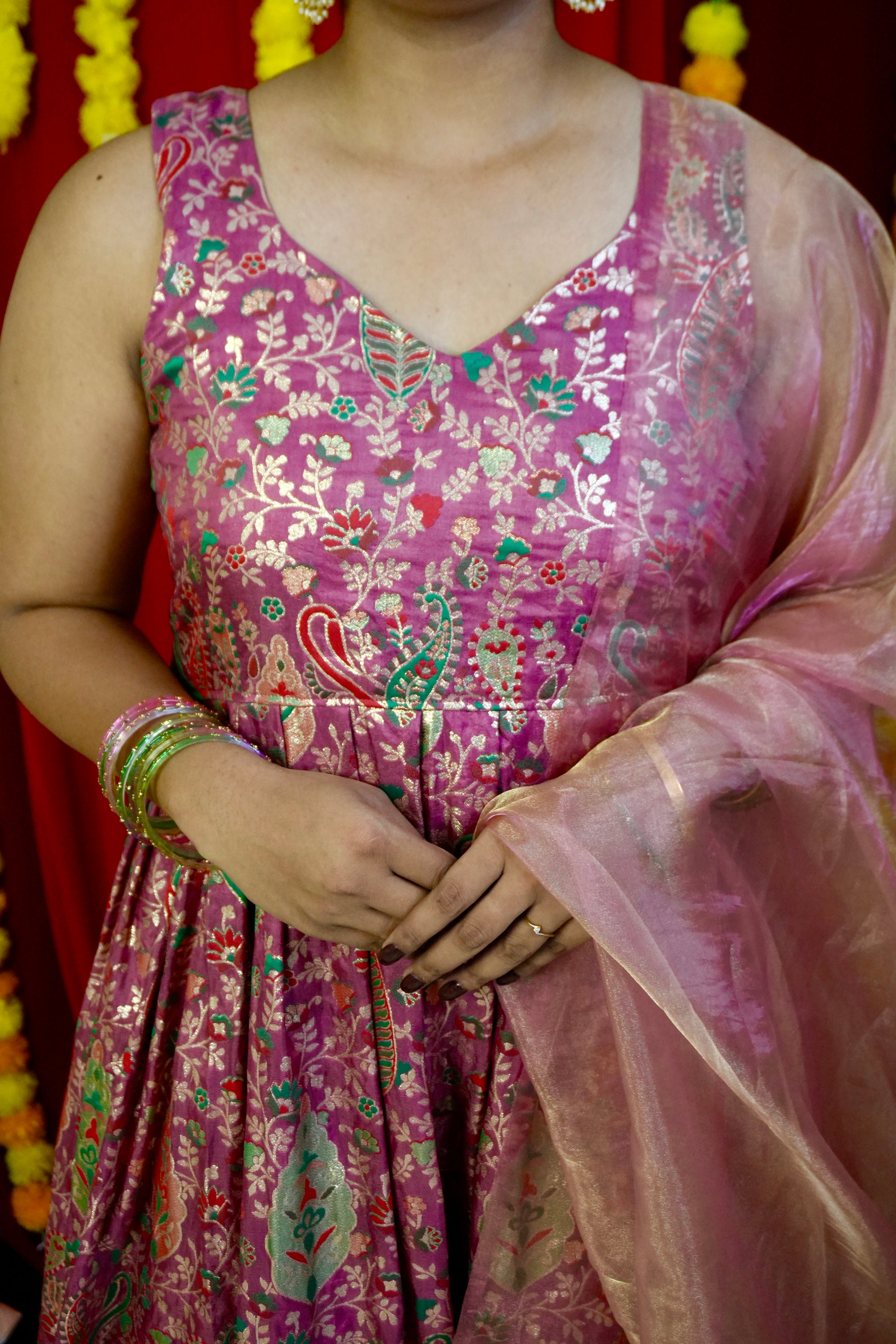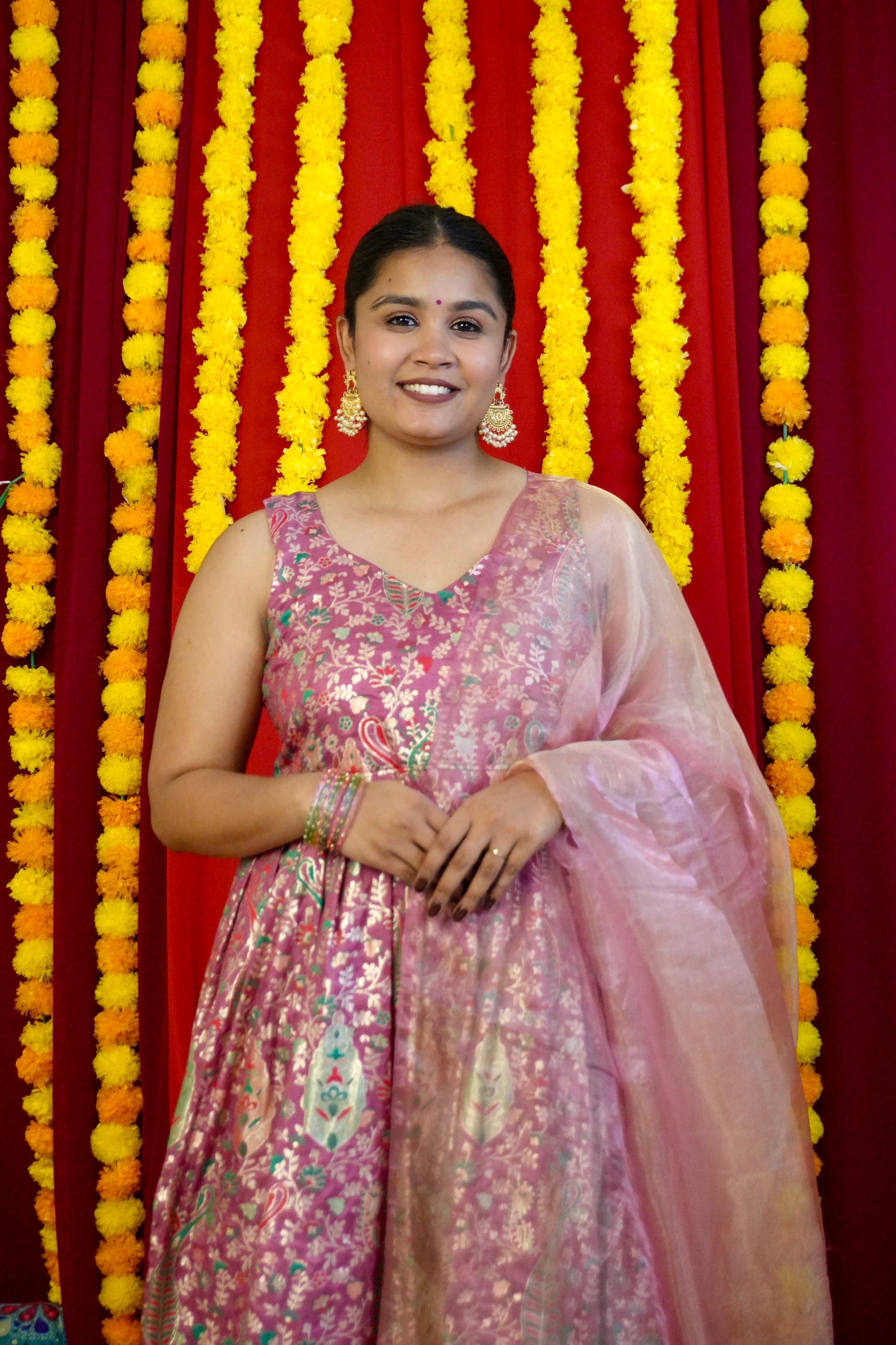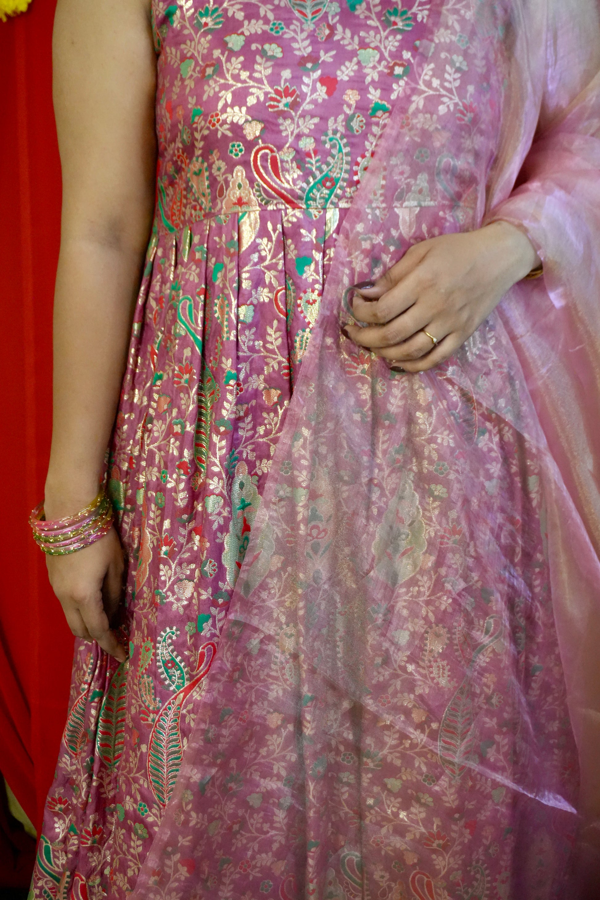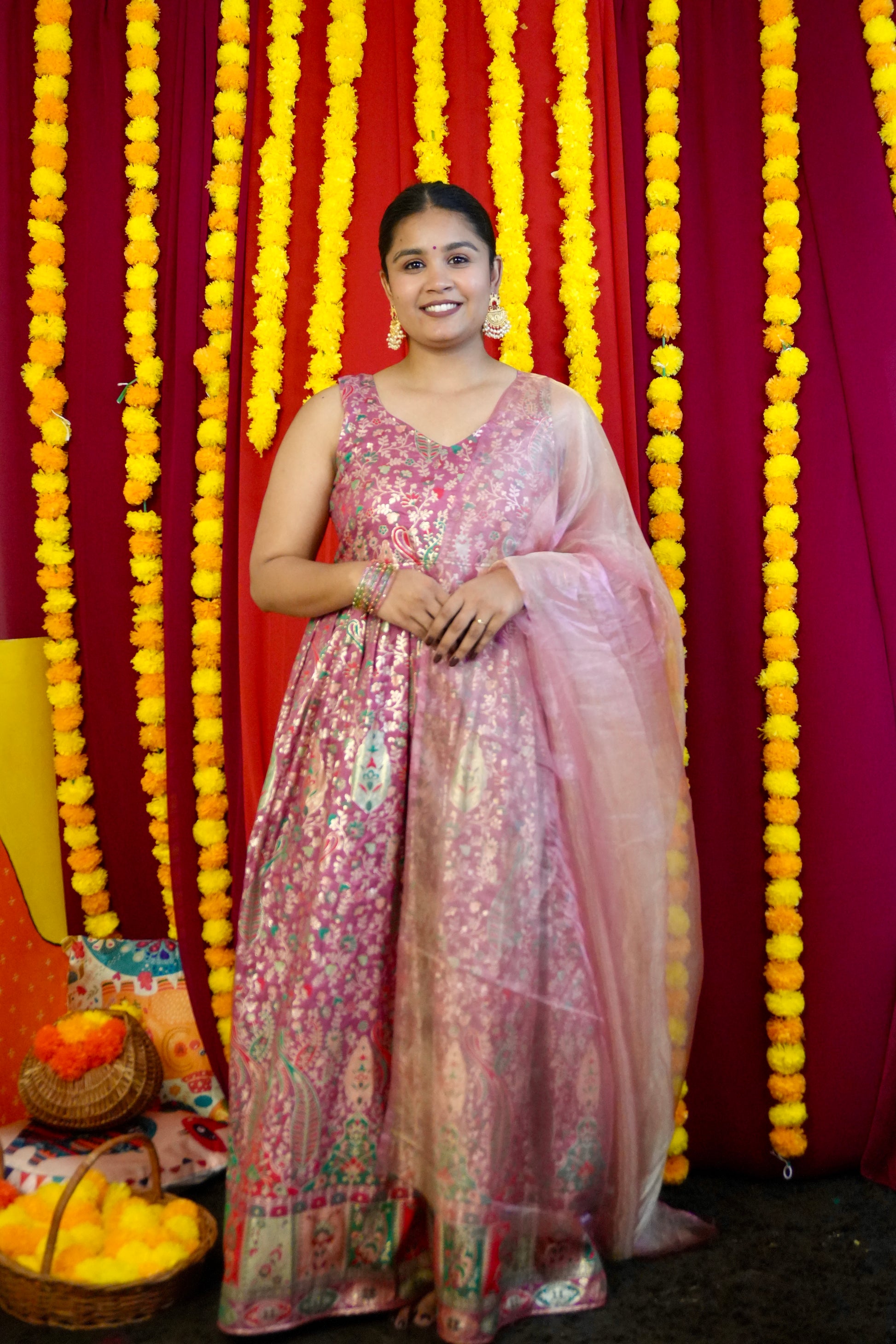 Crafted in a dreamy pink hue with intricate Banarasi motifs and fine embroidery spread all over — it’s a piece that speaks of tradition, charm, and quiet grandeur.