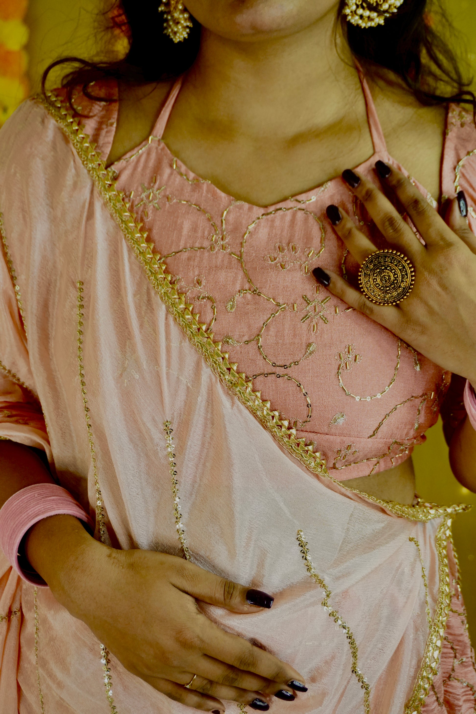 Gulabi barfi is a pastel dream — a baby pink lehenga adorned with intricate golden nug work on the lehenga, choli, and dupatta. The soft pink fabric pairs with glistening gold details to create the perfect festive balance — subtle yet radiant, just like Diwali lights.”