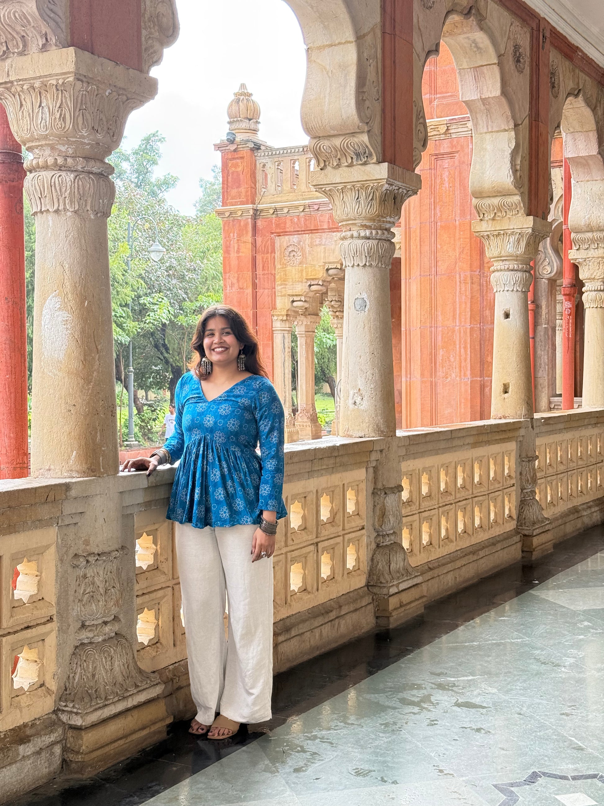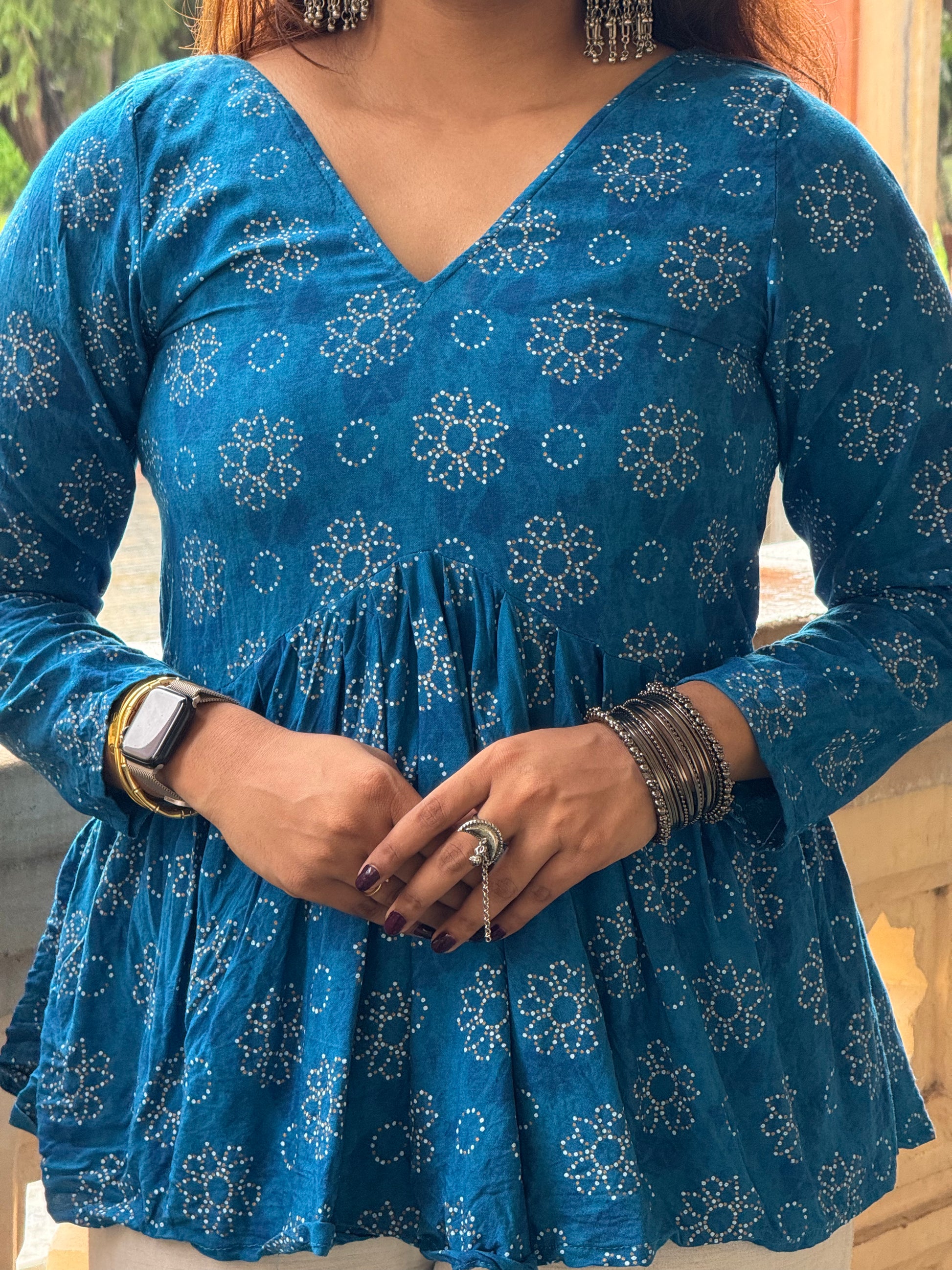 Induvati — a name that evokes the calm glow of moonlight — is an ode to quiet elegance. Crafted in cotton, this peplum-style kurta features a flattering V-neckline, three-fourth sleeves, and a graceful flared silhouette. The indigo base is adorned with subtle white dotted floral motifs.