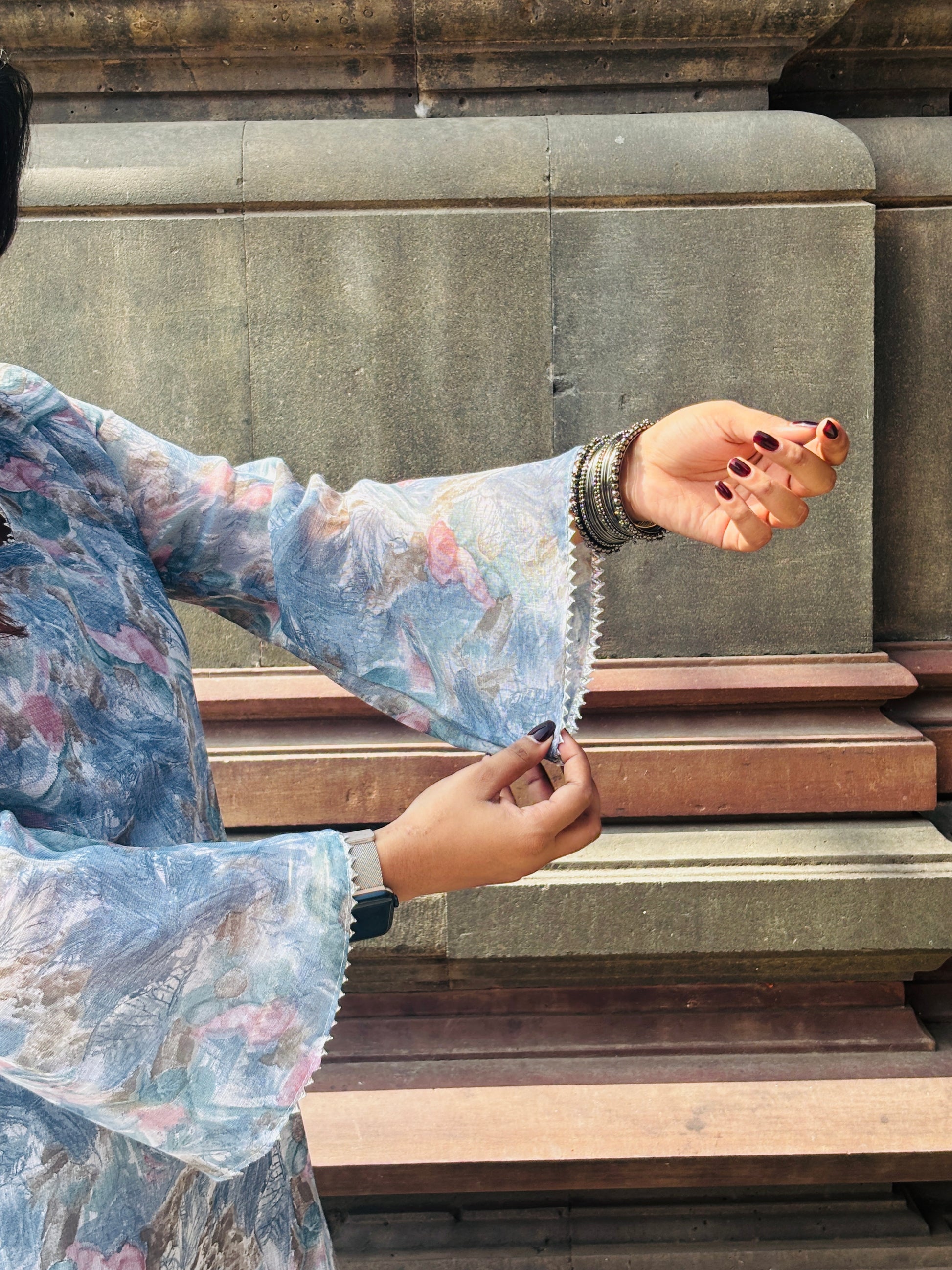 Khushi is a celebration of grace, comfort, and charm — a perfect blend for those who adore soft florals and airy silhouettes. This suit set features a gentle V-neck with lace details and full sleeves with umbrella pattern and a flowy silhouette that flatters without fuss. Paired with comfortable palazzos that come with functional side pockets.