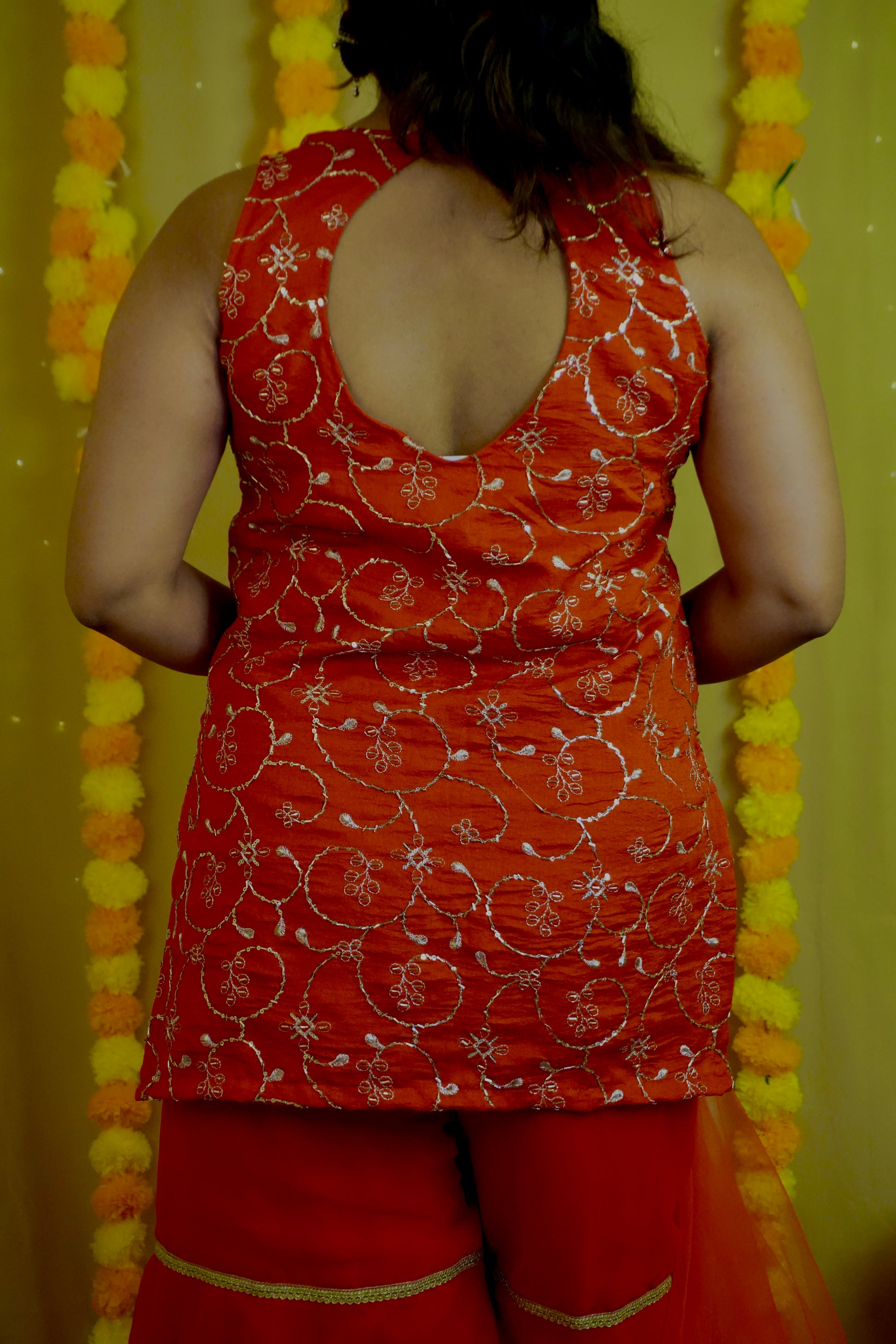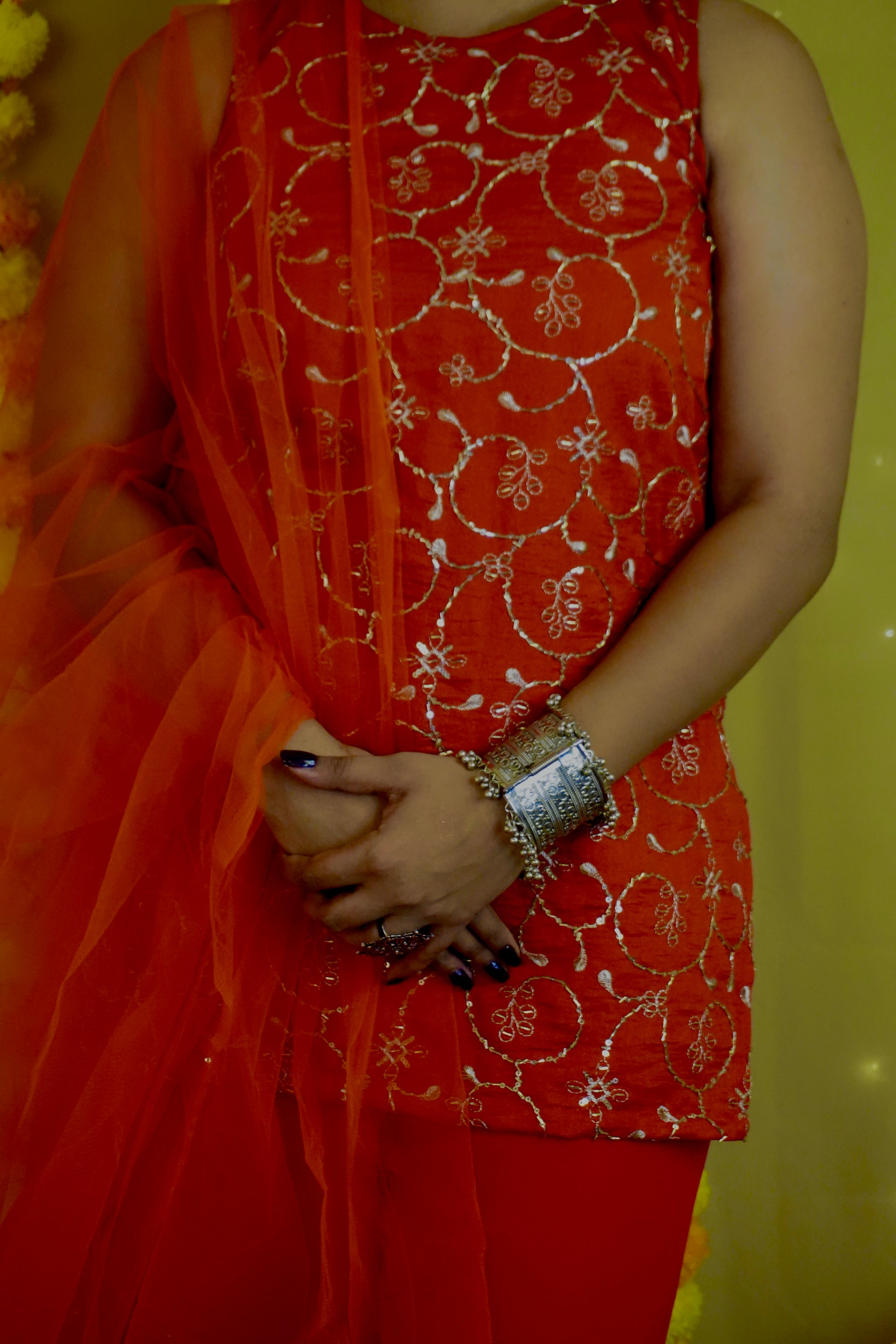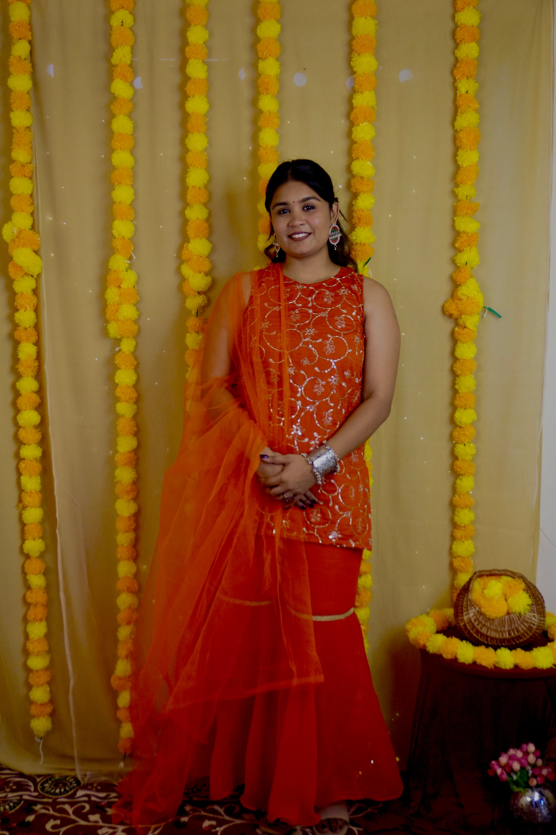 Celebrate Festivals in effortless elegance with our Motichoor set — a perfect blend of tradition and contemporary charm. The vibrant orange kurta features delicate golden nug work, adding a subtle shimmer that catches the light beautifully. The front gol gala offers a classic, modest touch, while the designer back gala adds a hint of modern sophistication.