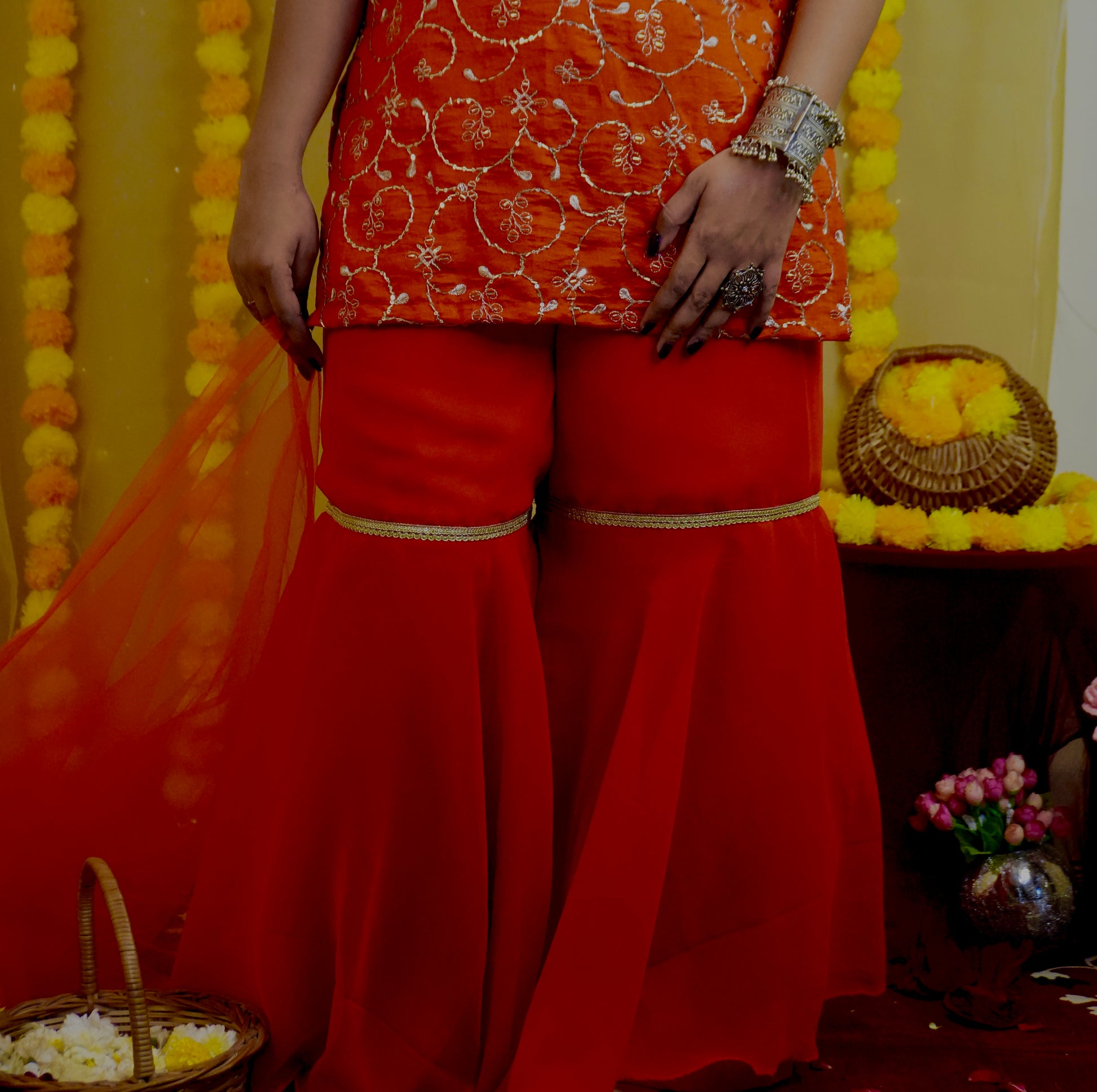 Paired with a flowing sharara and a matching chunni, this set is designed for comfort and grace, making it ideal for festive gatherings, pujas, or family celebrations.