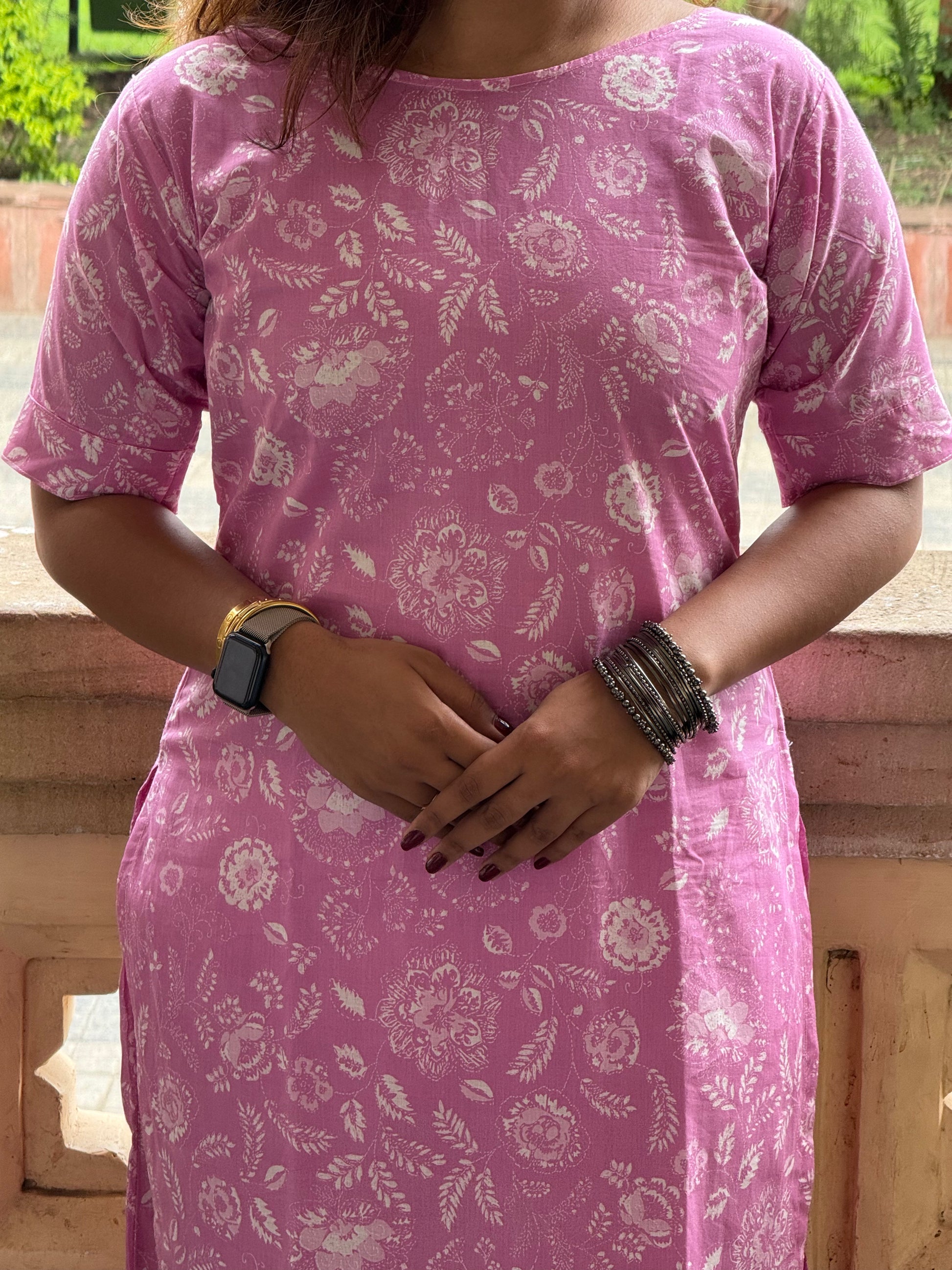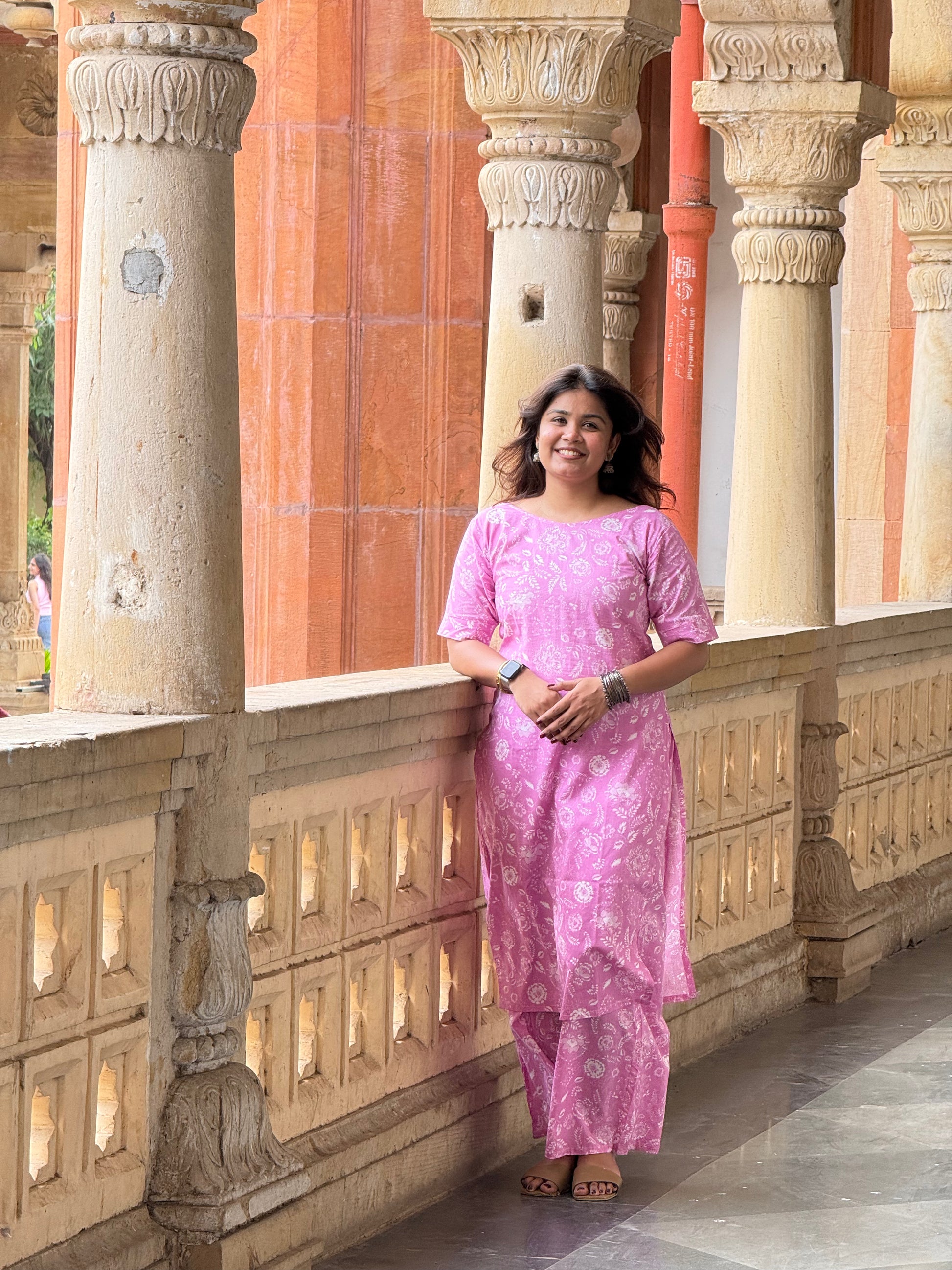 Nazakat, meaning grace or delicateness in Hindi. This light pink suit set is crafted from pure cotton. The kurta features a gentle boat neck, three-fourth sleeves, and a flowy silhouette that flatters without fuss. Paired with comfortable palazzos that come with functional side pockets.