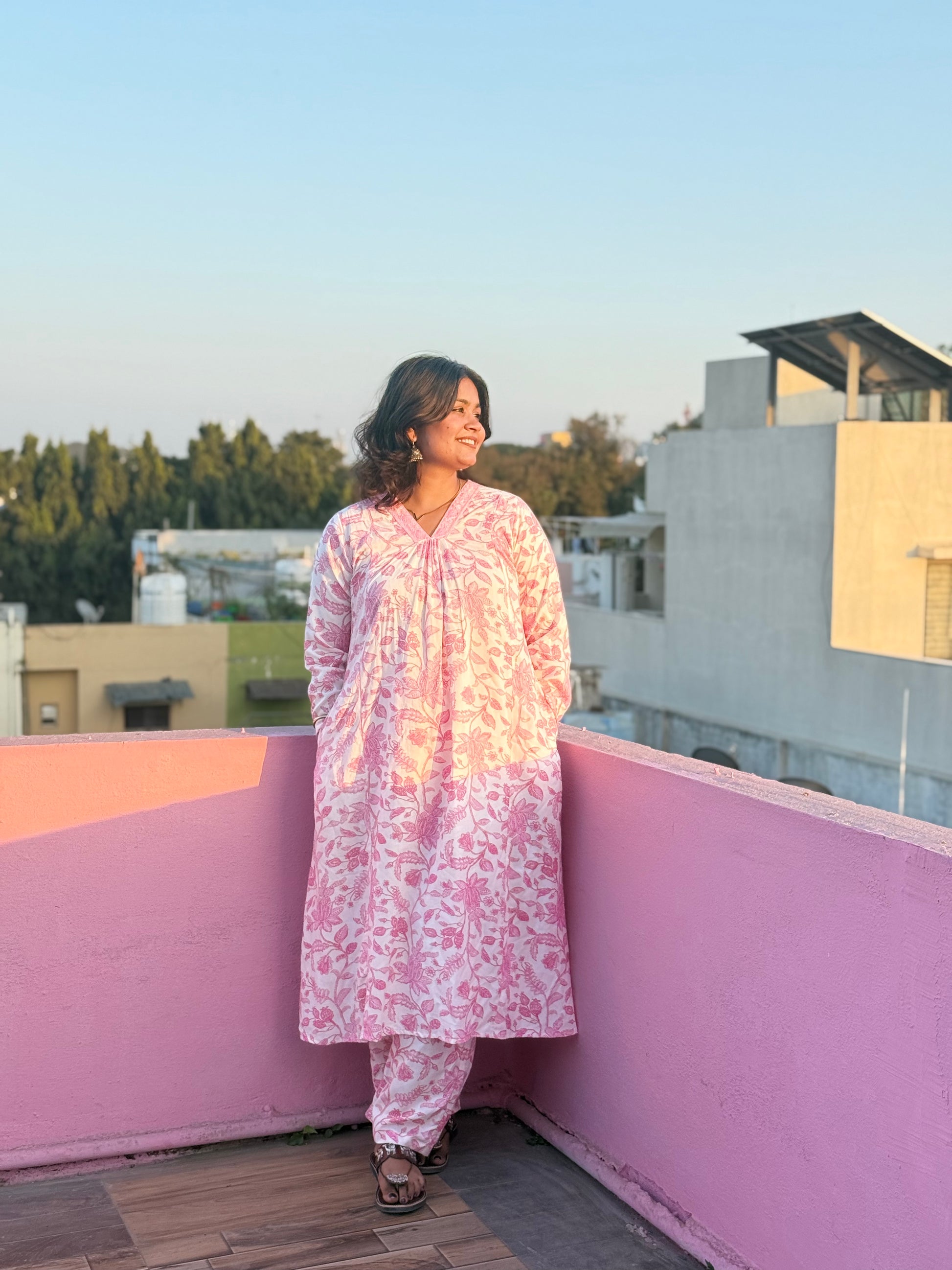 Pankhuri a graceful cotton suit set crafted in a white base with light pink prints, designed for comfort and effortless everyday wear.