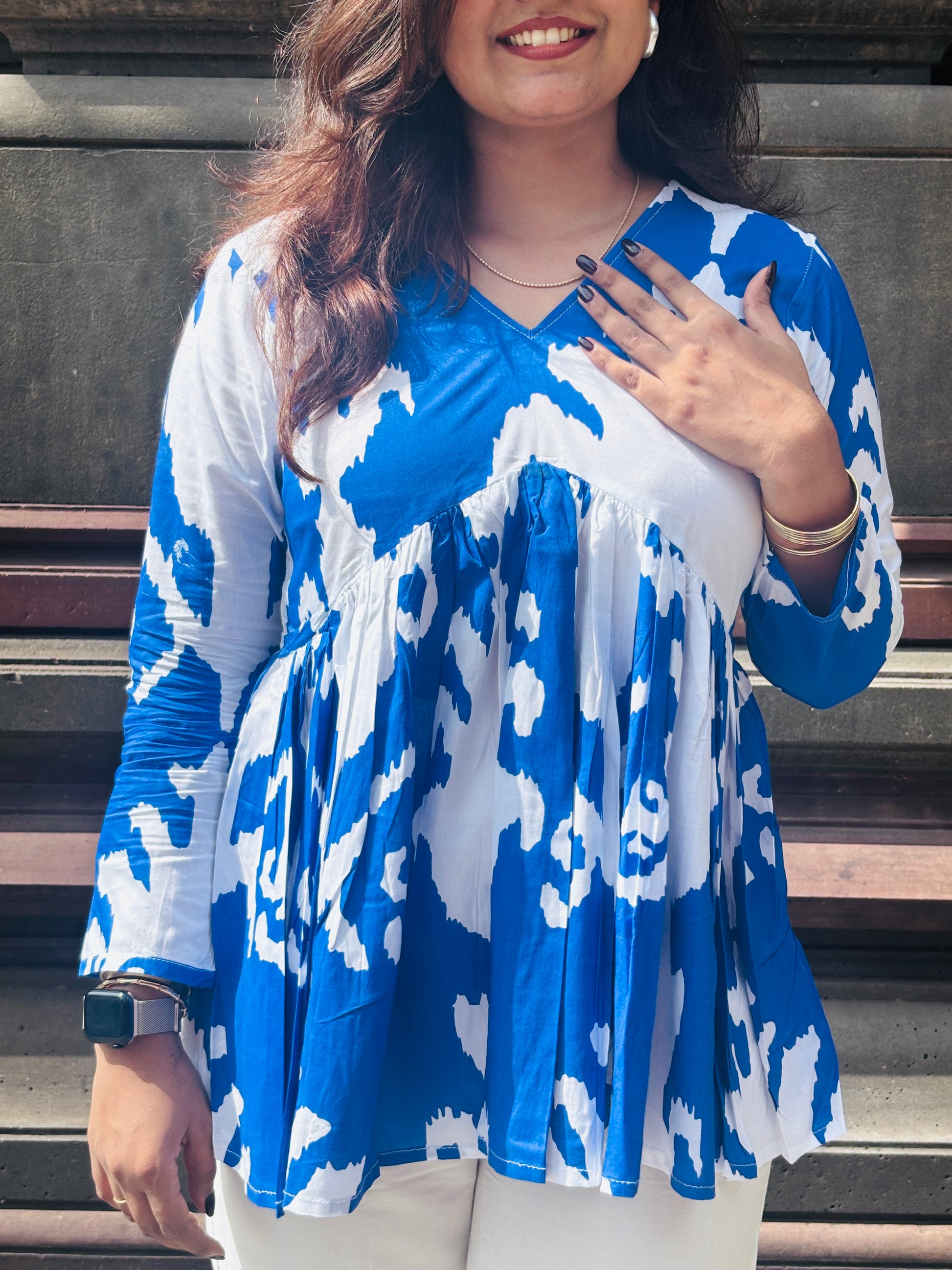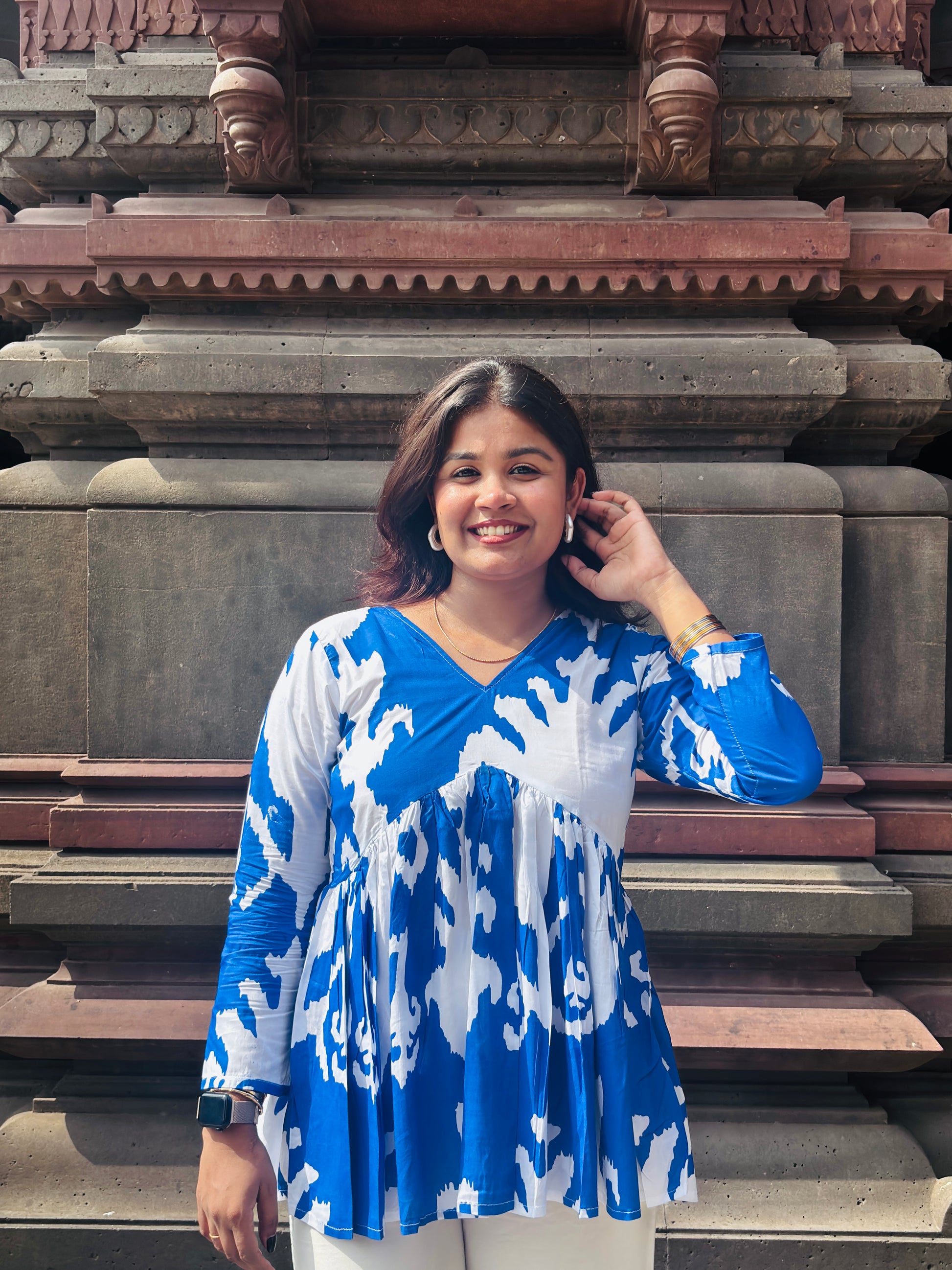 Advitaa name that evokes the calm, is an ode to quiet elegance. Crafted in cotton, this peplum-style kurta features a flattering V-neckline, three-fourth sleeves, and a graceful flared silhouette. The indigo base is adorned with subtle white dotted floral motifs.