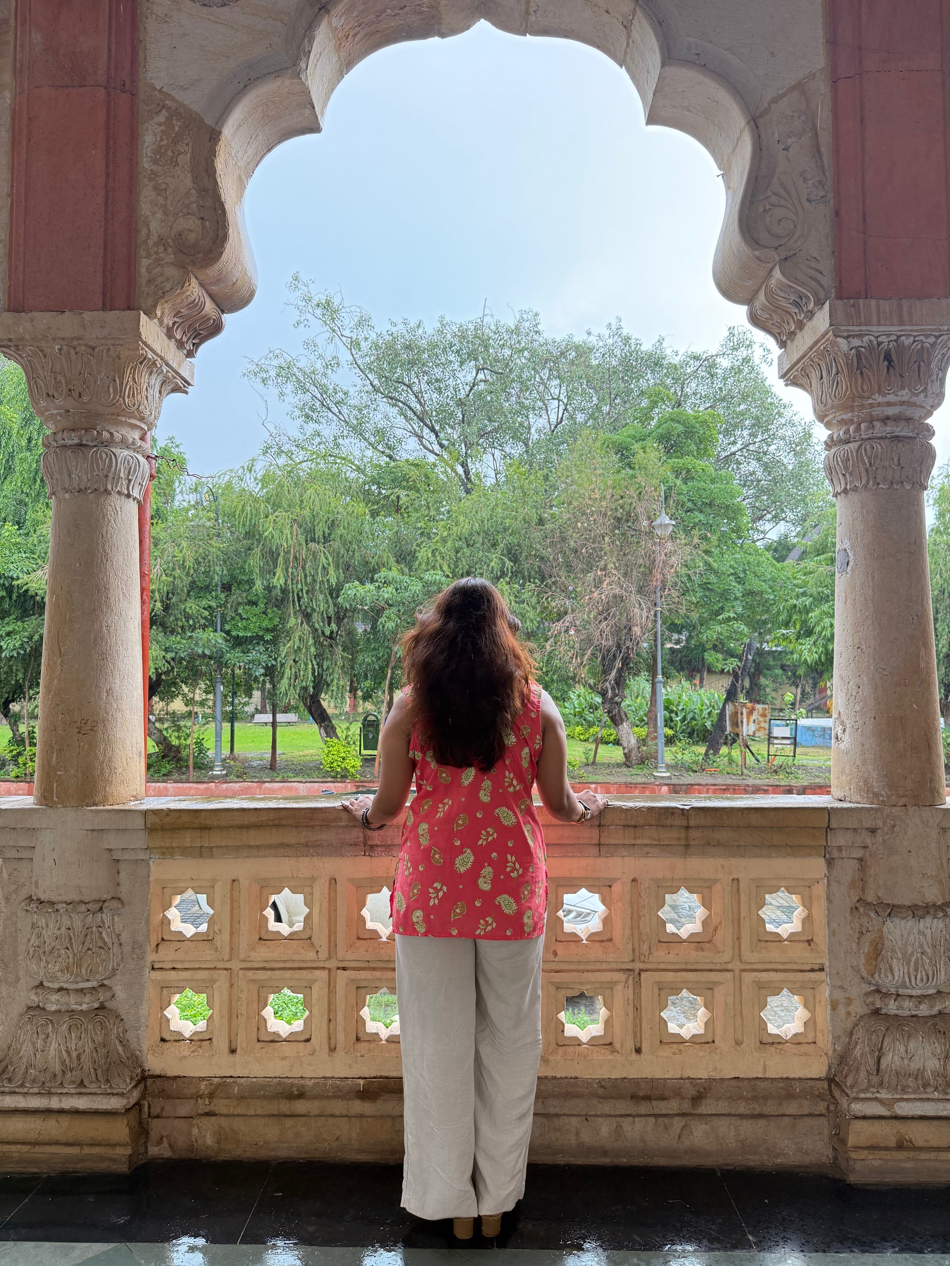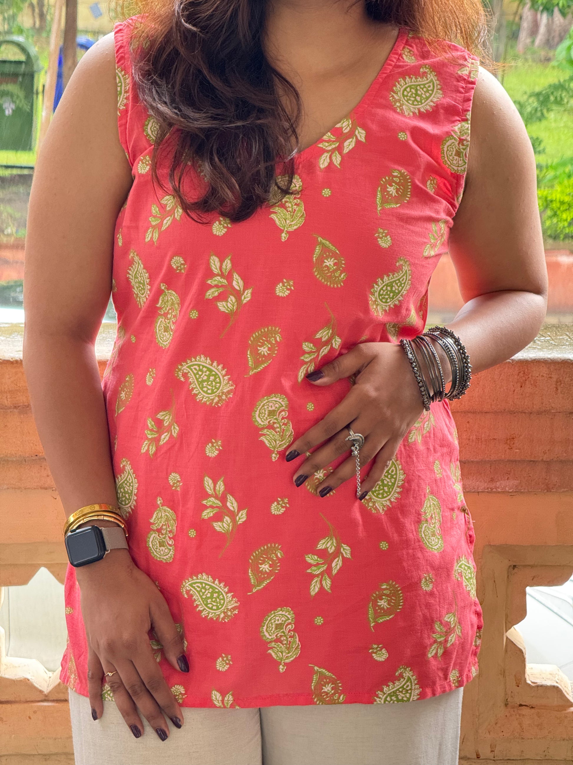 Named after the melodic soul of Indian classical music. This sleeveless kurta in coral pink is adorned with olive paisley motifs. Made with 100% pure cotton, it offers day-long comfort with an effortlessly elegant silhouette.